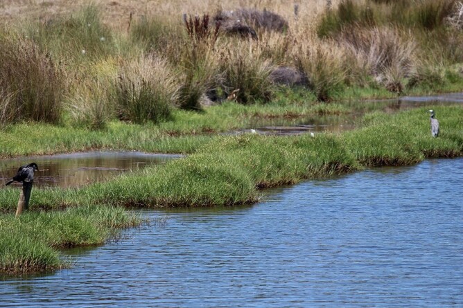 Bitterns are large birds with light and brown streaks in their plumage which helps them blend into the raupo wetland grasses and reeds. If approached they exhibit secretive behaviour and are known for their distinctive “freeze pose” straightening themselves up and pointing their beaks into the sky which lines up with the raupo and makes them difficult to spot. When it is windy, they may sway to make themselves blend in more with their environment or flatten themselves on the ground to disappear from view.